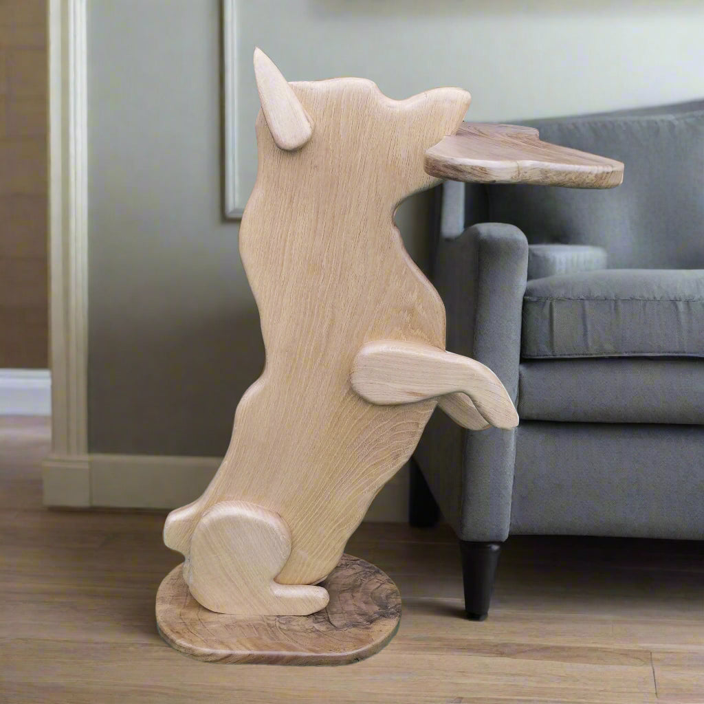 Bring charm and character into your space with this whimsical yet sophisticated corgi-shaped side table. Expertly crafted from solid oak, the body captures the playful silhouette of a corgi in a warm, natural finish. A rich walnut base provides contrast and stability, while a delicately carved walnut bone serves as a handy tray—perfect for holding your favorite drink, book, or treats. This functional piece is as delightful as it is practical, making it an instant conversation starter and a unique addition to any living room, reading nook, or pet lover’s space. We can create these tables in ANY breed of dog of your choice.