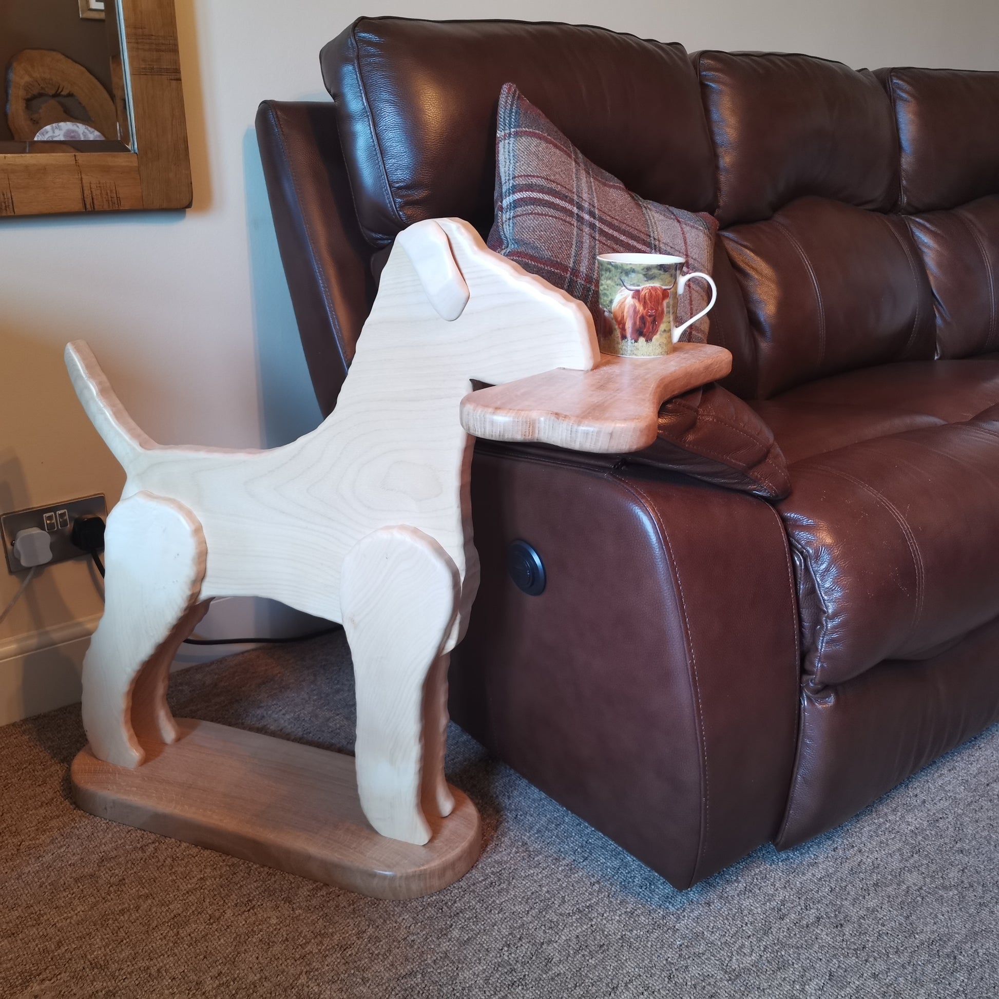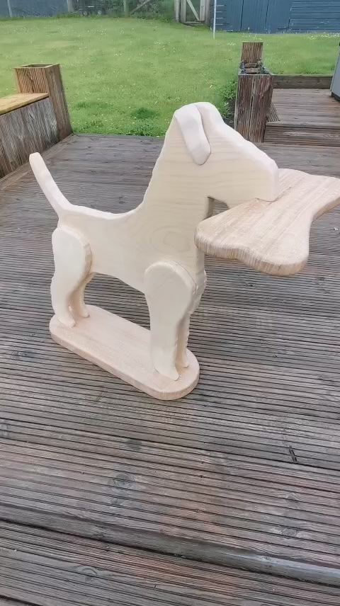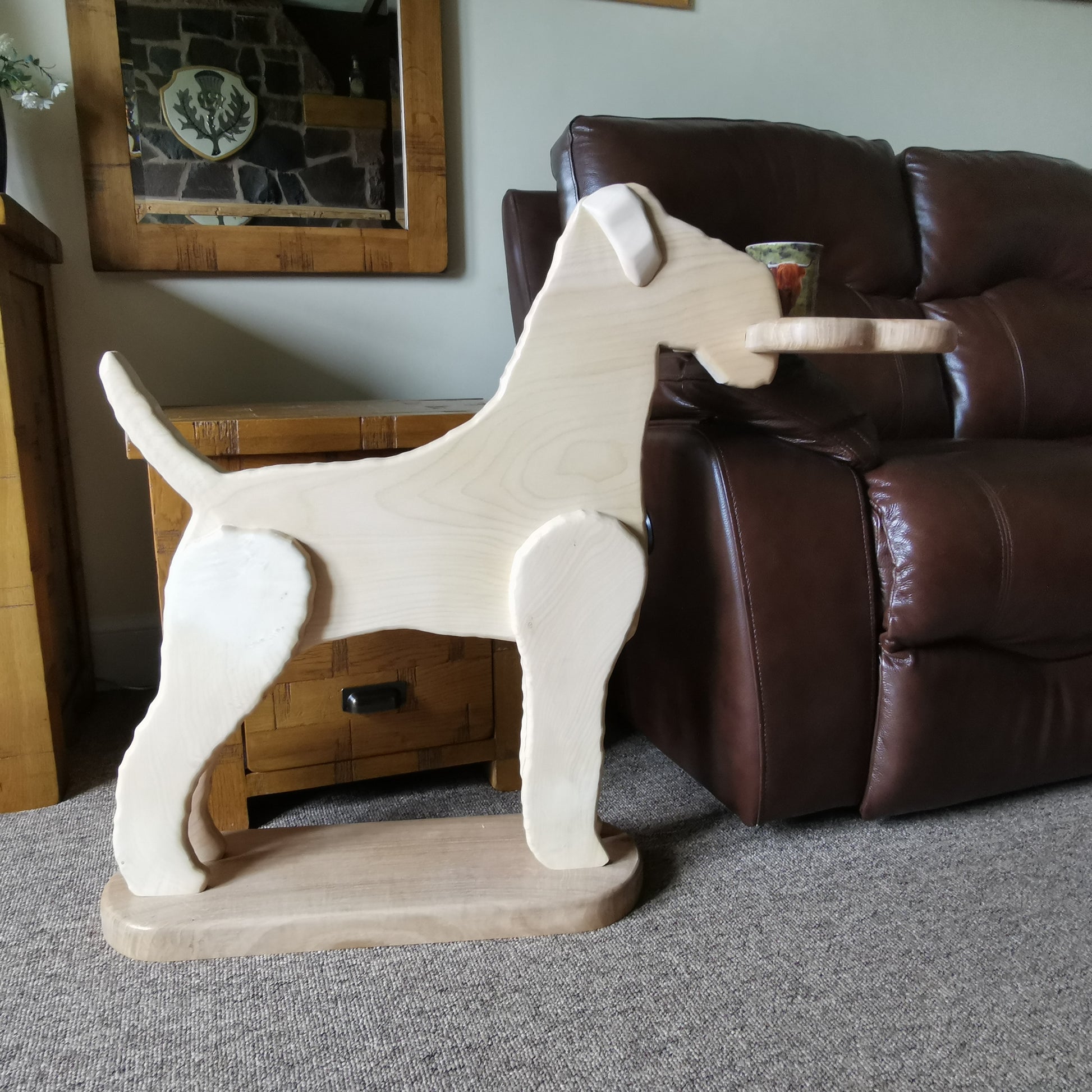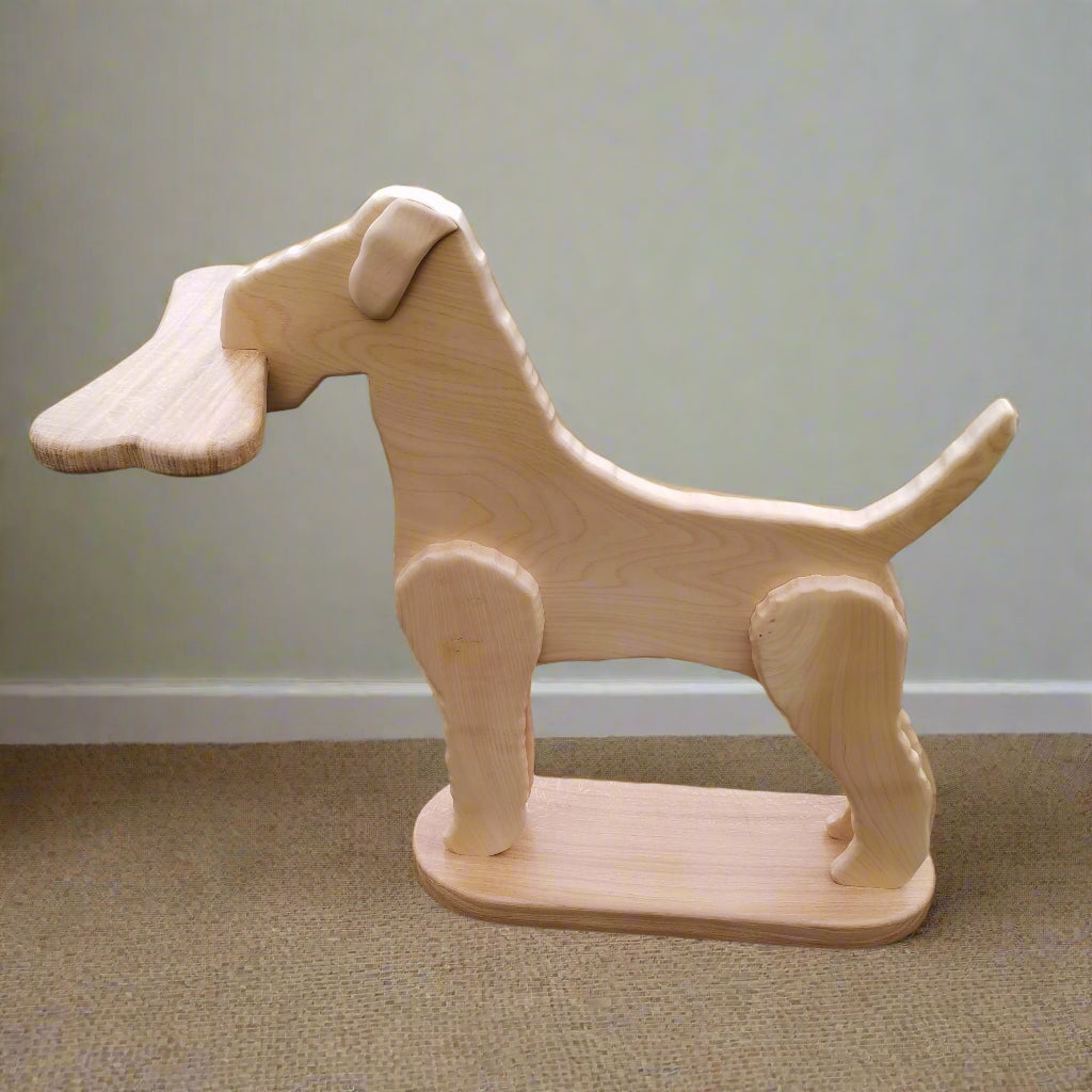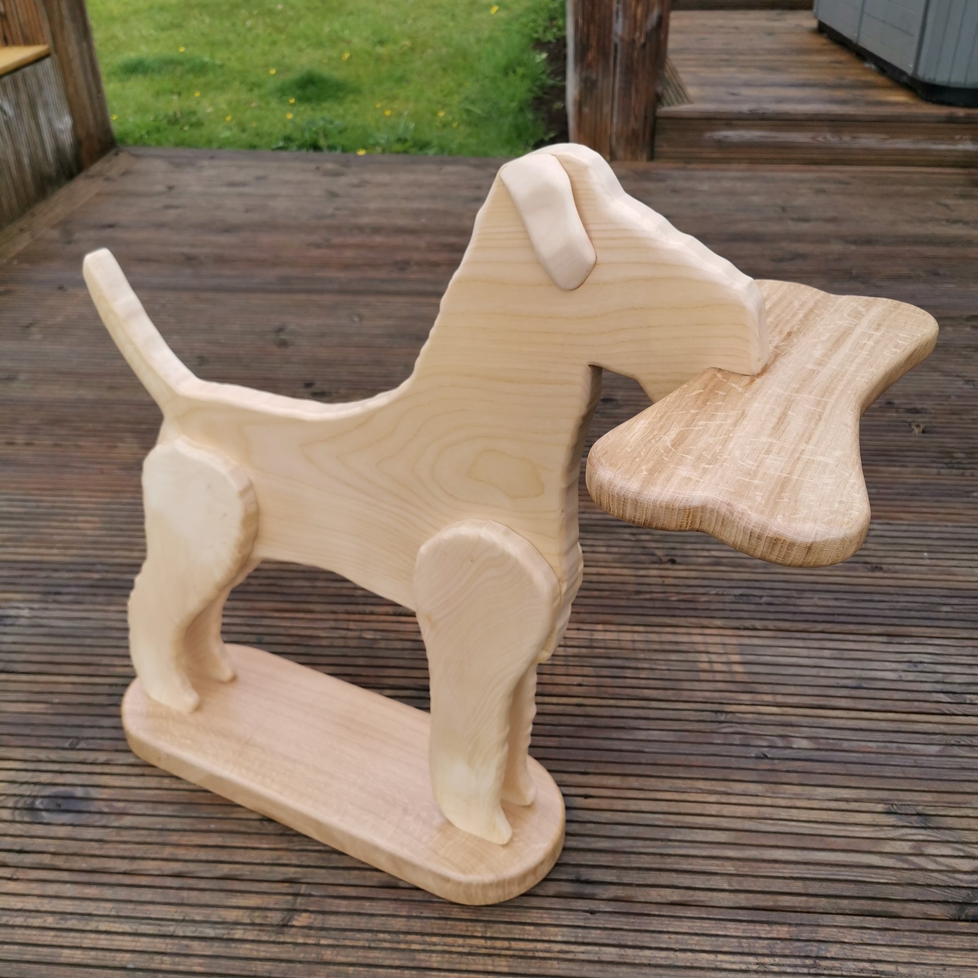 A charming and functional piece, this side table is crafted in the form of a stylized fox terrier silhouette. The body is precision-cut from solid chestnut, showcasing the rich grain and warm tones of the wood. It stands on a sturdy oak base, providing stability and contrast with its darker hue. Held gently in the terrier’s mouth is a carved oak bone, cleverly designed to support a robust tray for added functionality. The entire piece is spray-finished with a natural varnish, enhancing the wood’s character while preserving a soft, matte luster. We can create these tables in ANY breed of dog of your choice.