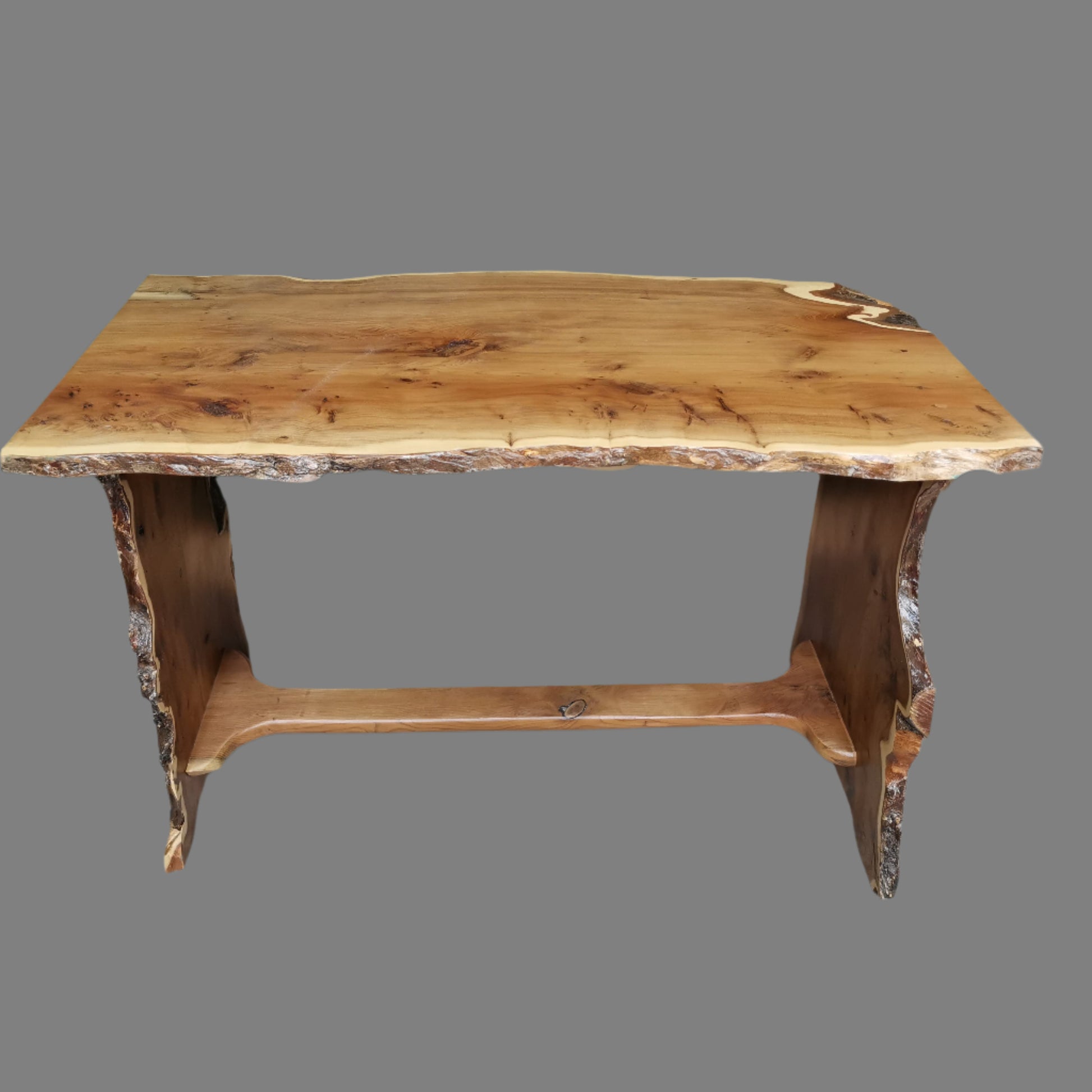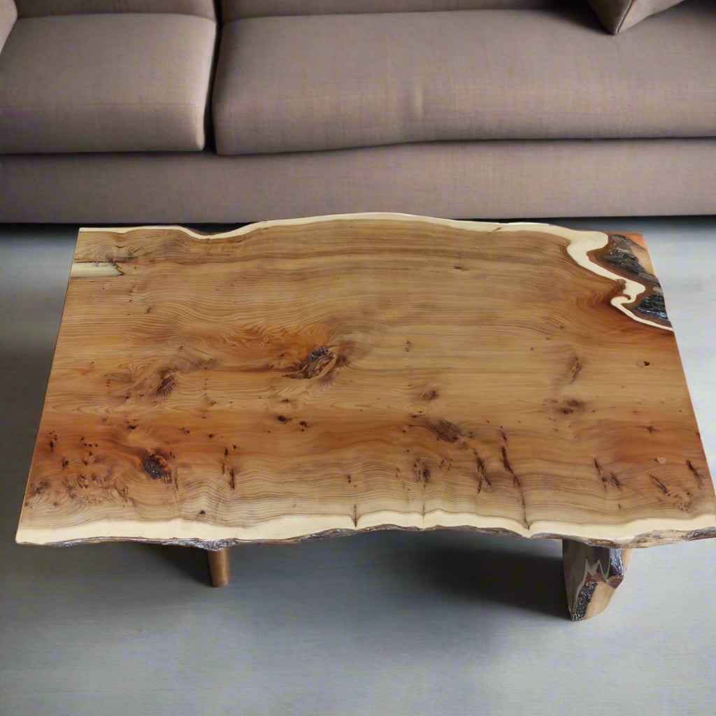 Bring organic beauty and timeless craftsmanship into your home with this stunning live-edge yew coffee table. Handcrafted from a single slab of richly grained yew wood, this piece showcases the natural contours and character of the tree, including unique knots, swirls, and vibrant hues ranging from warm amber to deep russet.