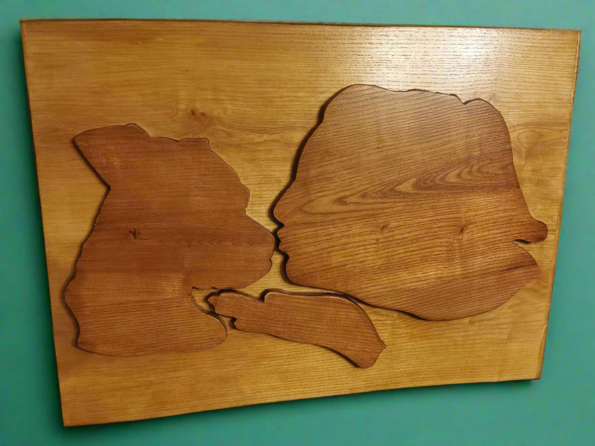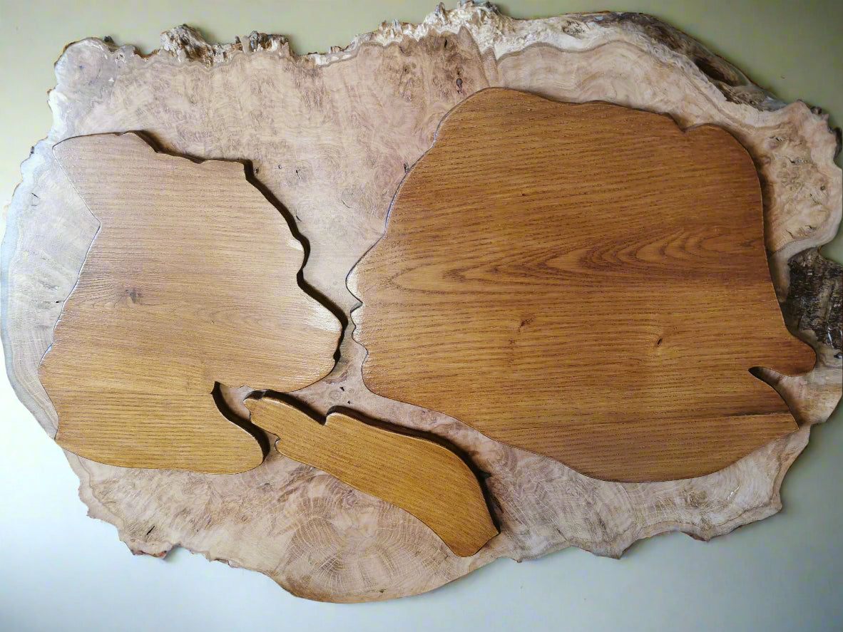 This wall art is a striking and personal piece made from finely finished wood. At its heart, it features silhouettes—custom cutouts that represent individual profiles—mounted seamlessly onto a beautifully grained and live-edge solid wooden backboard. The backboard itself preserves the natural contours and texture of the wood, offering an organic frame that contrasts with the smooth, stained surface of the silhouette figures.