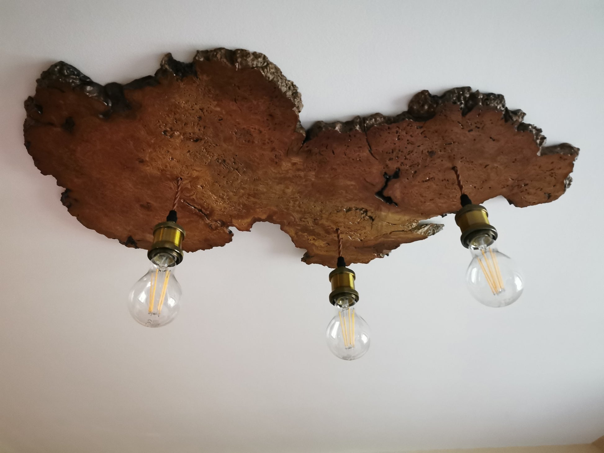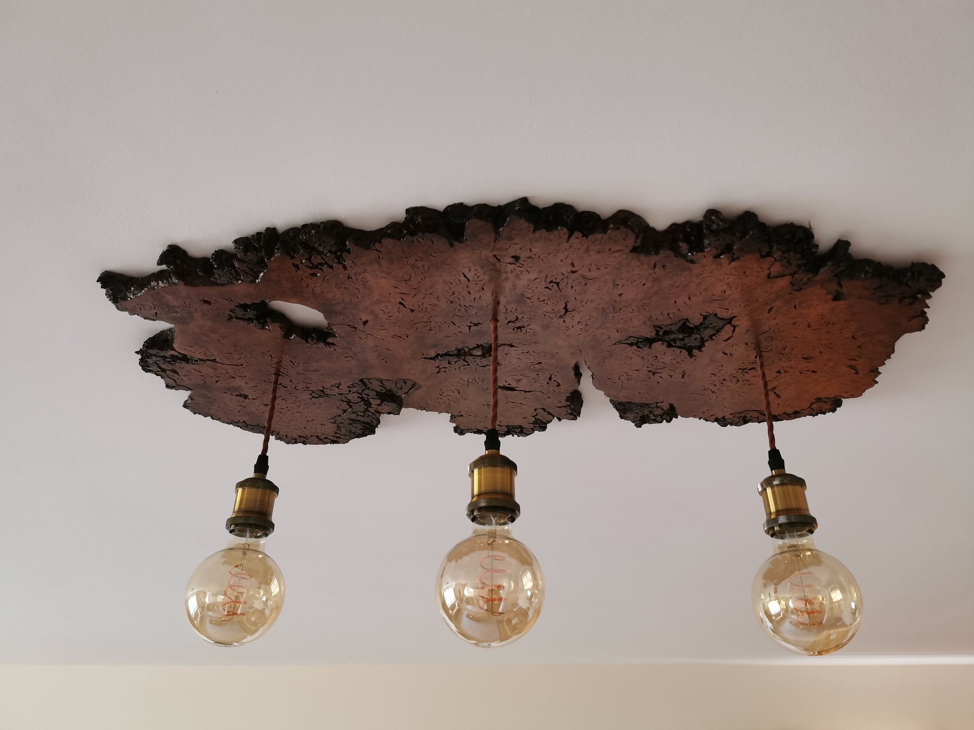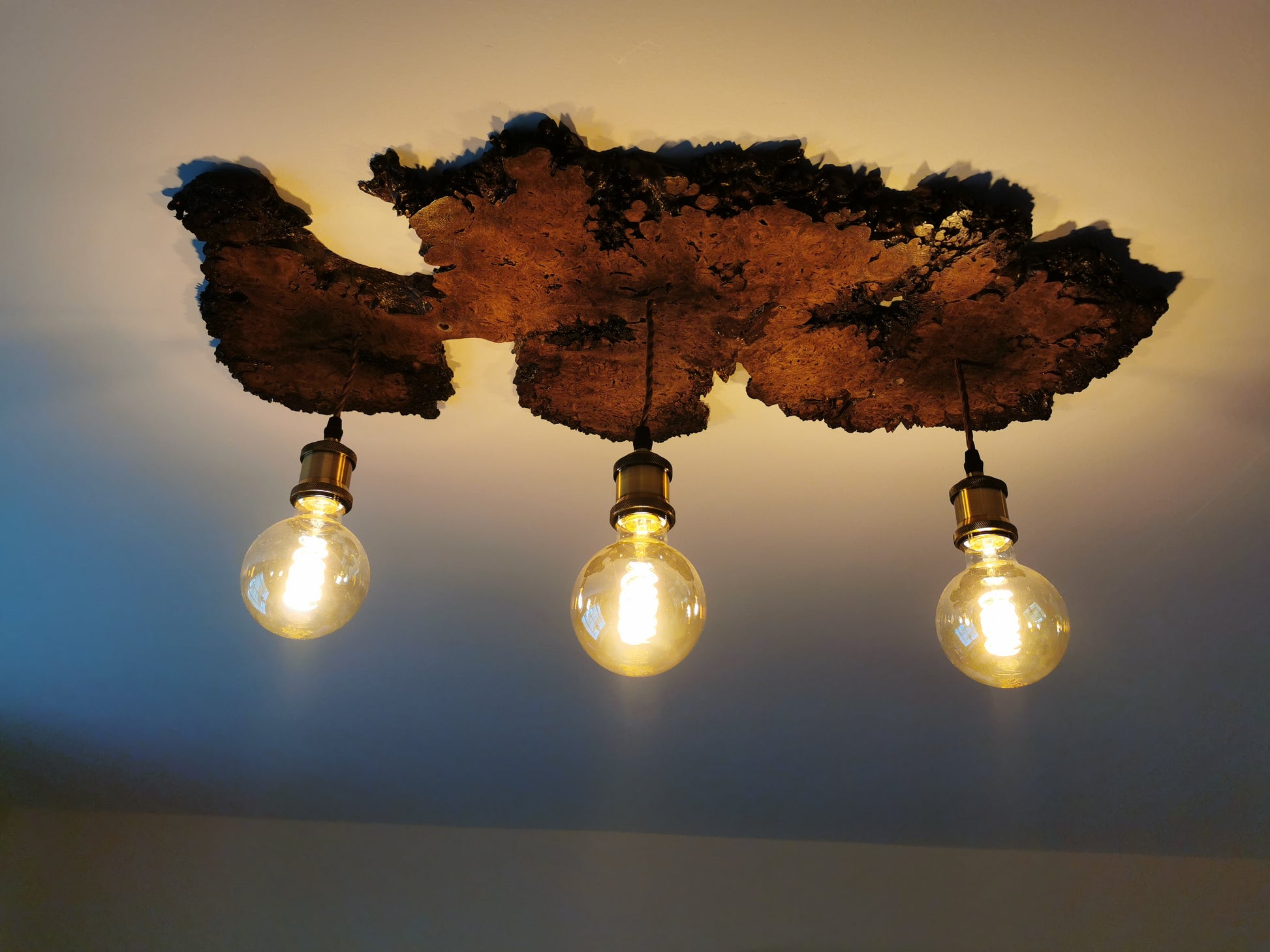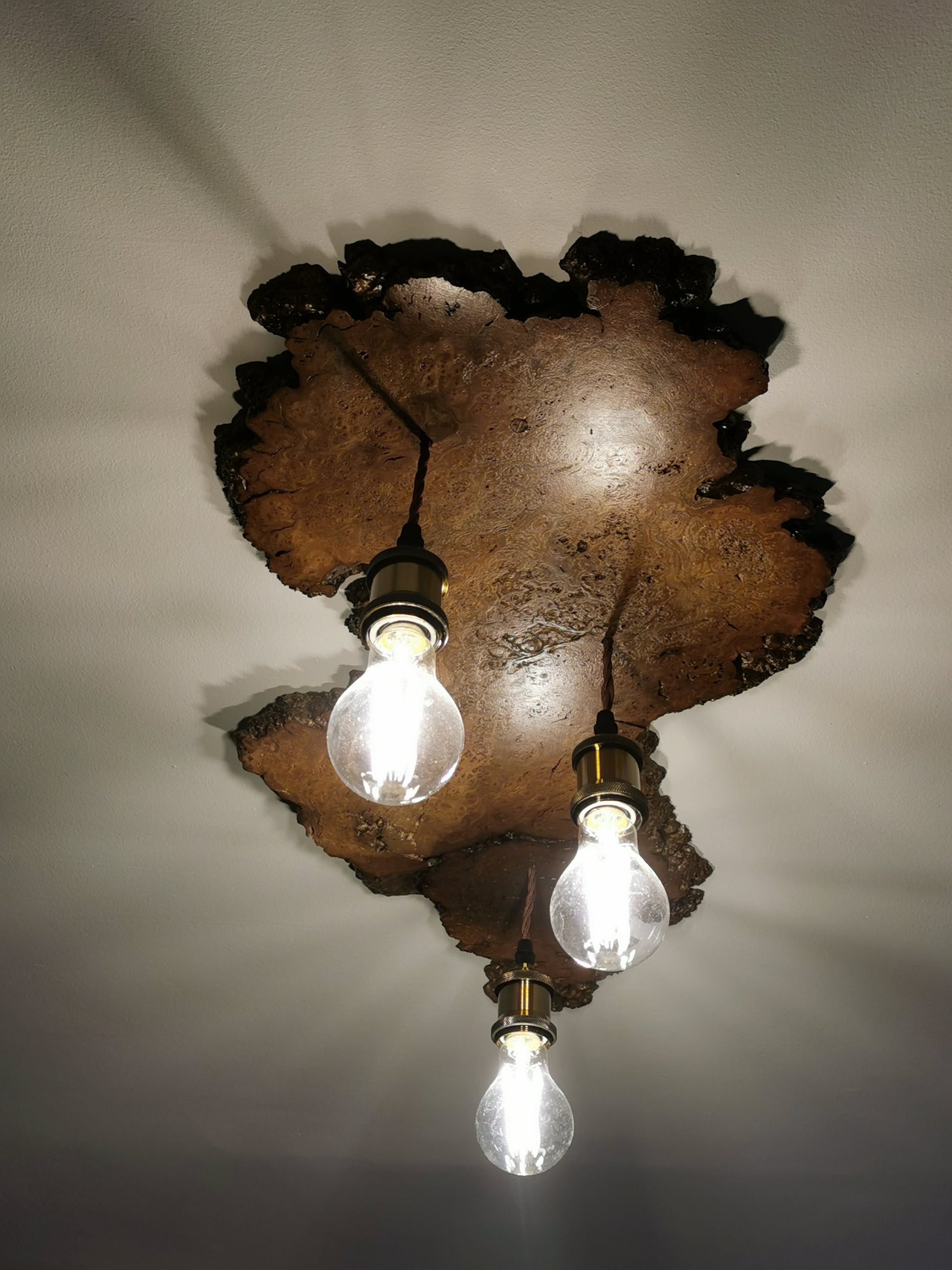 Bring warmth and character to your space with this handcrafted rustic ceiling light, featuring a beautifully finished live edge oak board. The natural grain and organic edge of the solid oak create a stunning focal point, rich in texture and charm. Suspended from the board are three antique brass pendant lights, each with a vintage-inspired socket and braided cord, offering a timeless industrial flair.