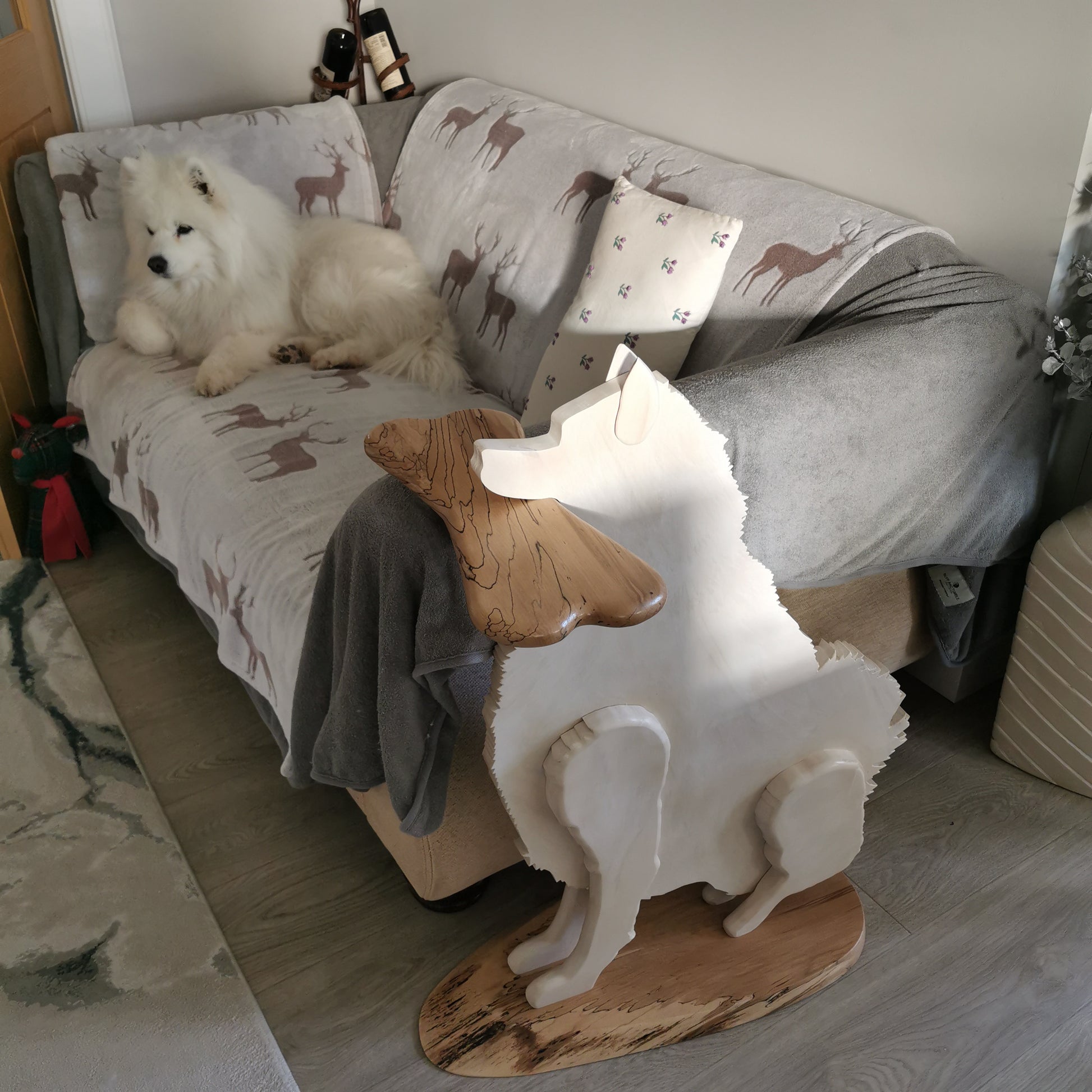 Celebrate your love for Samoyeds with this beautifully handcrafted side table, made in the heart of Scotland. Carved from sustainably sourced hardwood, this unique piece combines fine craftsmanship with a charming tribute to one of the world’s most beloved dog breeds.