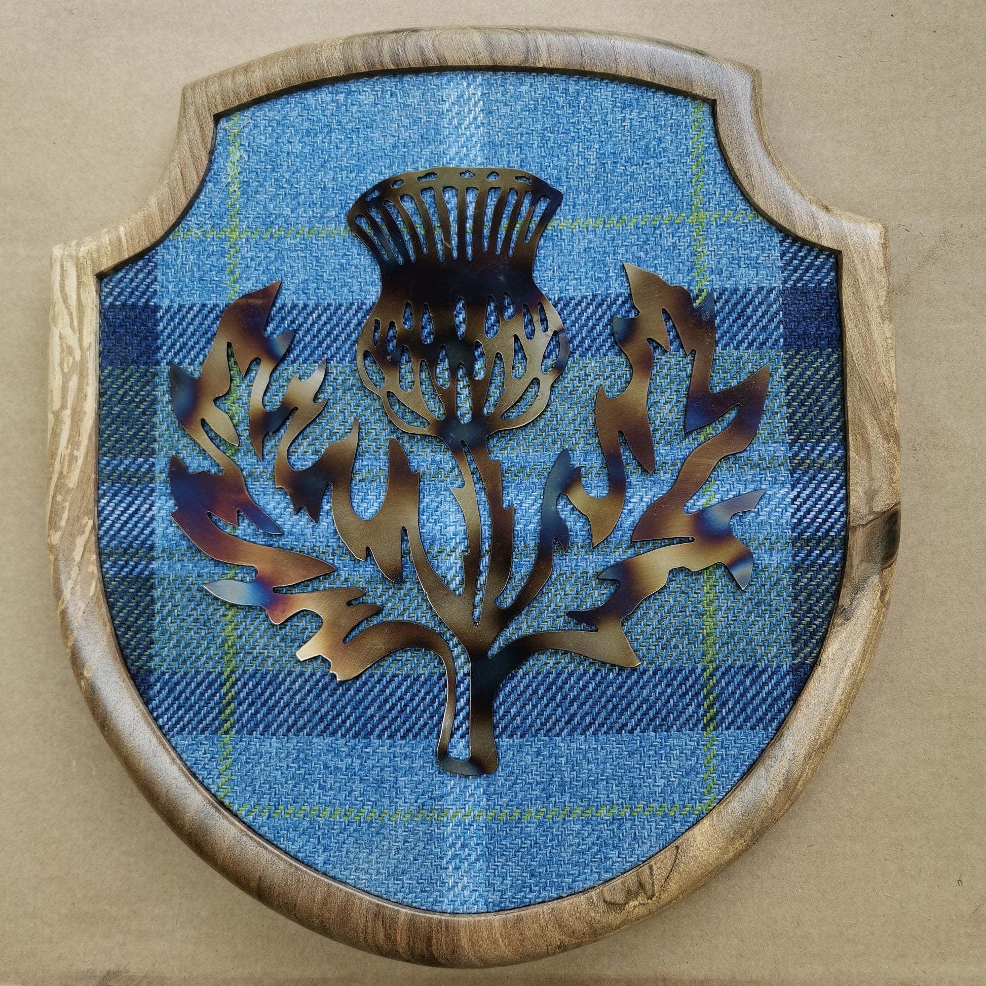 Celebrate Scottish heritage with this beautifully crafted decorative plaque. Framed in rich, warm walnut wood, the plaque features a classic blue tartan fabric insert at its center — evoking the timeless charm of Scotland's Highland tradition. Overlaid on the tartan is an intricately cut metal thistle, the national flower of Scotland, symbolizing resilience and pride. Perfect for display in the home or as a thoughtful gift, this elegant piece blends traditional Scottish elements with refined craftsmanship.