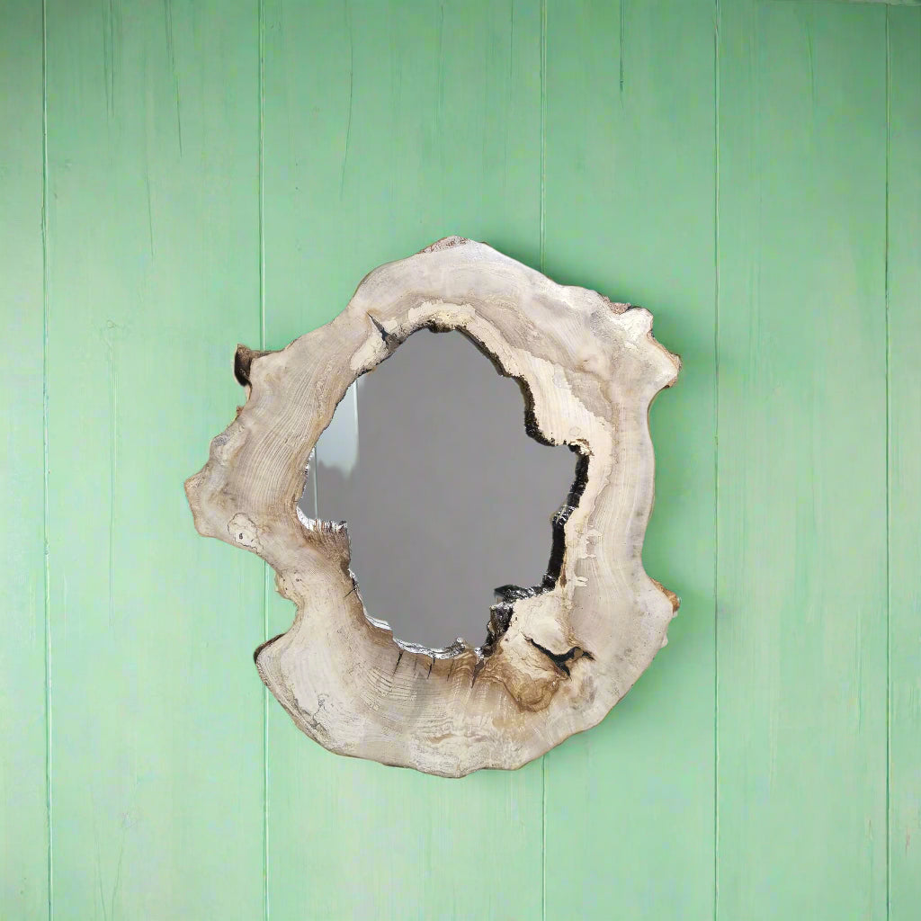 Each mirror is handmade, ensuring no two are exactly alike — a true piece of functional art that tells the story of the wood's natural journey.
