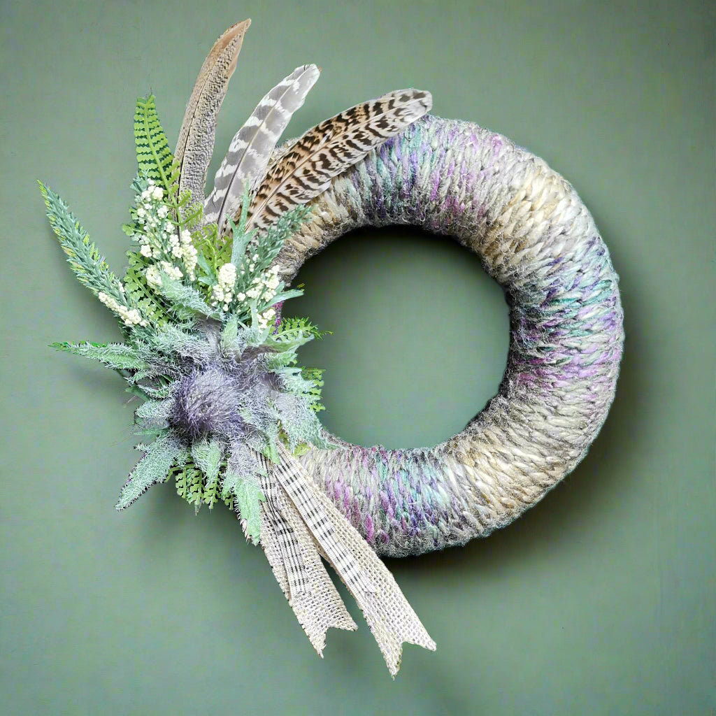 This handmade woolen wreath is a perfect blend of rustic elegance and soft charm. Crafted with warm, textured wool, it brings a cozy, inviting feel to any space. Delicate feathers add a whimsical, natural touch, while a beautifully tied bow completes the look with timeless grace. Whether hung on your front door, above a mantel, or as part of your seasonal décor, this wreath is sure to make a heartfelt statement. Ideal for gifting or keeping for yourself—because your home deserves a little handmade magic.